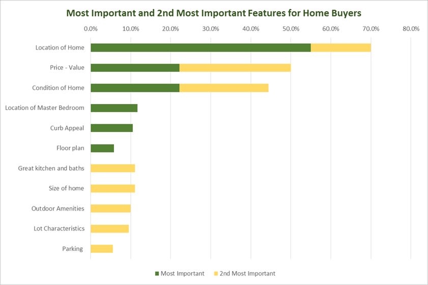 Price value is ranked as the second most important criterion for buying a home. Half responded that price-value was either the most important feature or the second most important feature in the purchase decision. Again, this is no surprise to us. Purchasing a home is a major financial decision. The “Value Proposition” is top of every buyer’s mind. The home must meet or exceed the buyer’s expectations about what they should be getting for a specific price. The digital world has made information readily available for smart buyers. Buyers come equipped with their price-per-square-foot analyses and room-by-room comparisons.